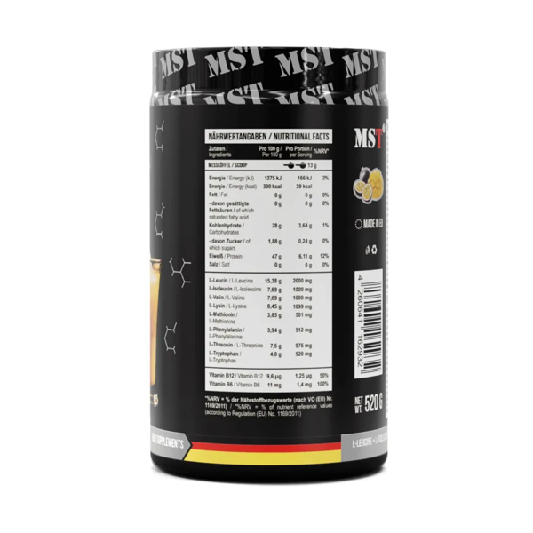 BCAA&EAA Zero від MST – комплекс, що містить вісім незамінних амінокислот, які беруть участь у ключових фізіологічних процесах організму. Продукт випускається у вигляді швидкорозчинного порошку з різними смаками: огірок-лайм, персиковий чай з льодом, кола-лайм, манго-маракуя, чорна смородина, мохіто.