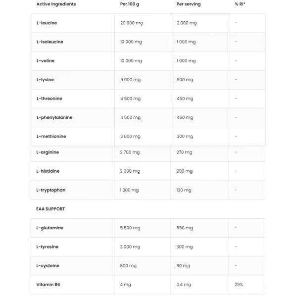 OstroVit EAA – это высококачественный комплекс незаменимых аминокислот, дополненный веществами для их лучшего усвоения и повышения эффективности. EAA необходимы для синтеза белка, поддержания мышц и регенерации после тренировки. Употребление комплекса перед тренировкой обеспечивает организм строительным материалом для мышц, а после тренировки способствует быстрому восстановлению. Кроме того, ЭАА поддерживают иммунную и нервную системы, улучшают энергетические процессы и защищают мышцы от катаболизма. Благодаря дополнительным компонентам – глютамину, тирозину, цистеину и витамину В6 – добавка также обладает антистрессовым и общеукрепляющим действием. Продукт изготовлен из высококачественного сырья и имеет высокую биологическую ценность.