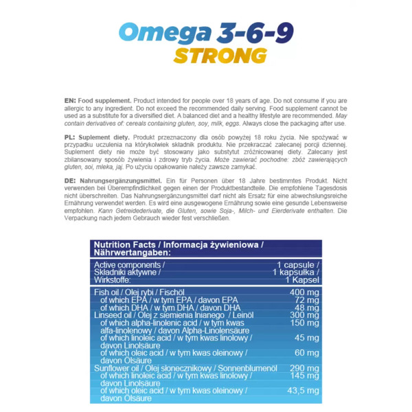 ALLNUTRITION OMEGA 3-6-9 STRONG zawiera содержит 400 миллиграммов рыбьего жира и 300 миллиграммов льняного масла. Кроме того, наша диетическая добавка содержит в своем составе 290 миллиграммов подсолнечного масла, благодаря чему она является отличным источником ненасыщенных жирных кислот.