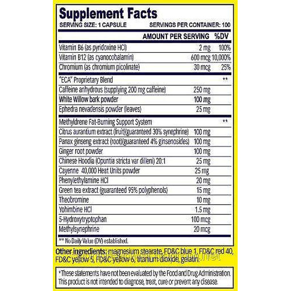 Одна капсула Methyldrene ECA 25 содержит мощную комбинацию компонентов, способствующих сжиганию жира, подавлению аппетита и увеличению энергетического потенциала организма.