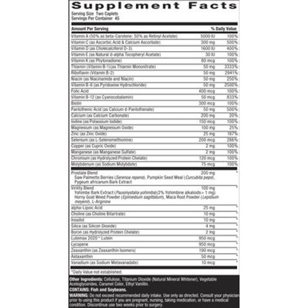 1600 МЕ витамина D-3 – применение витамина D-3 в правильном соотношении, что благотворно способствует улучшению здоровья костной и иммунной системы. Содержит важные минералы: цинк и хром. Они участвуют в метаболизме углеводов и расщеплении глюкозы. Содержит сочетание пальметто с мощными антиоксидантами, необходимыми для оптимального здоровья простаты и нормального мочеотделения. L-аргинина – необходимый для сохранения тонуса кровеносных сосудов и играет важную роль в сексуальном здоровье. Комплекс трав для мужской силы, включающий популярные травы. Витамины группы B необходимы для правильной работы сердечно-сосудистой системы, а также для производства энергии. Содержит энергетический бленд, который помогает повысить энергию и метаболизм, а также поддерживает сжигание калорий. Содержит важные минералы: цинк и хром. Они участвуют в метаболизме углеводов и расщеплении глюкозы.