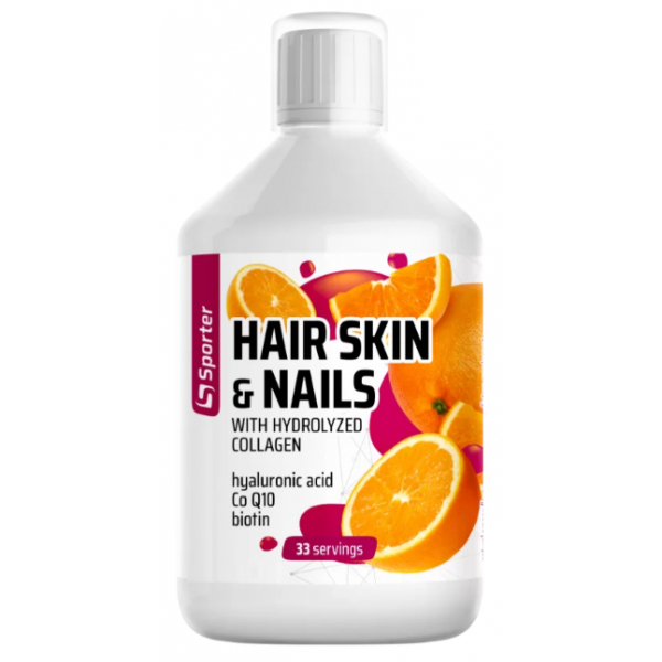Sporter Hair Skin & Nails 500 мл – питательная добавка в жидкой форме с ароматизатором, которая укрепляет волосы и ногти, а также замедляет процессы старения кожи.