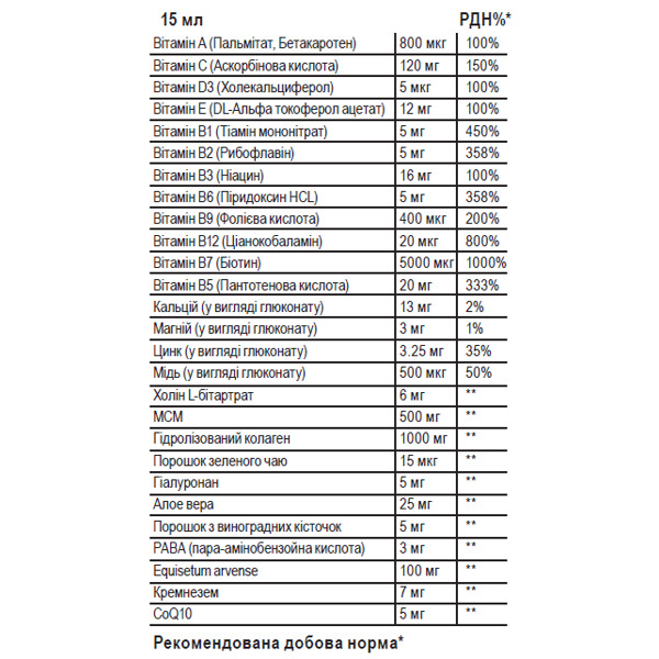 Пептиды гидролизованного коллагена и аскорбиновая кислота способствуют синтезу коллагена, входящего в состав соединительных тканей. Витамин А укрепляет структуру ногтей, витамин Е и гиалуроновая кислота помогают бороться с сухостью кожи и ломкостью волос, а цинк укрепляет волосяные фолликулы.