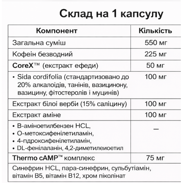 Способствует интенсивному сжиганию жира благодаря термогенным компонентам.