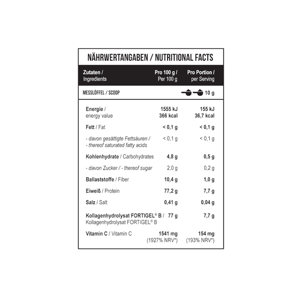 - Высокая концентрация биоактивных пептидов коллагена Fortigel®.