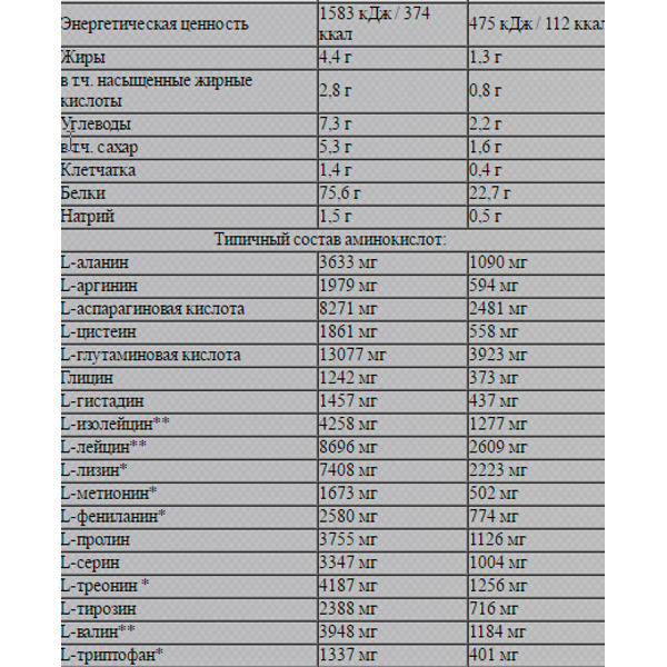 - Содержит все незаменимые аминокислоты, включая BCAA