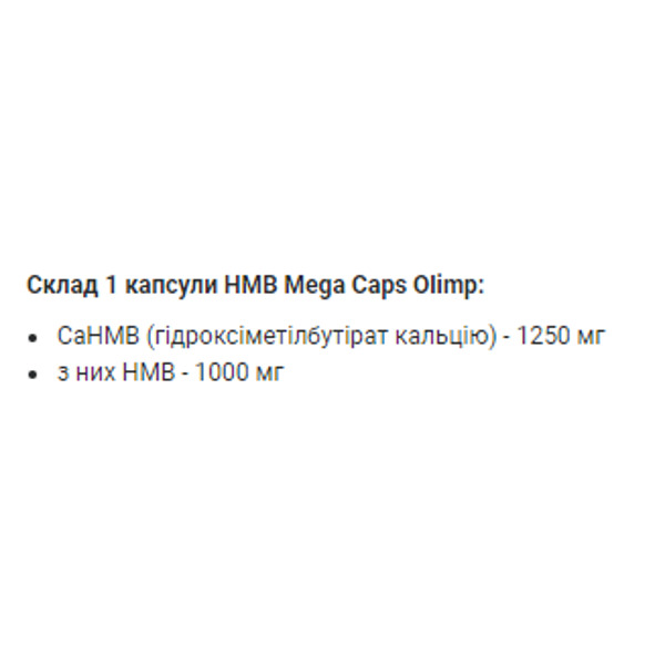 Olimp HMB 1250 Mega Caps - это пищевая добавка, которая содержит бета-гидрокси-бета-метилбутират (hmb).