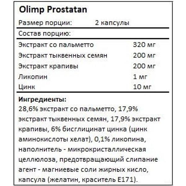 Олимп Простатан – специализированная биологически активная добавка, предназначенная для поддержания здоровья простаты и улучшения работы мужской мочеполовой системы. Формула основана на комбинации высокоэффективных растительных экстрактов и запатентованного Альбионом™ цинка в форме бисглицината, одной из наиболее усваиваемых форм микроэлемента. Продукт способствует нормализации гормонального фона, снимает воспаление, стимулирует выработку тестостерона и улучшает микроциркуляцию в тканях простаты. Помогает поддерживать потенцию, общую выносливость и укрепляет иммунитет. Рекомендуется мужчинам, которые хотят сохранить активность и качество жизни после 30 лет.