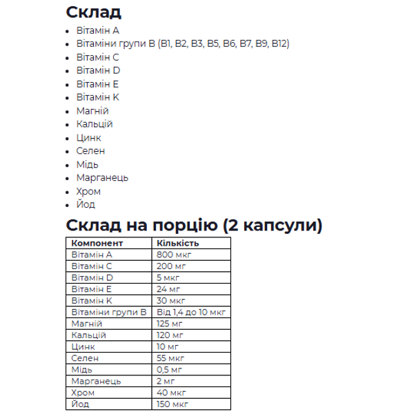 Принимать по 1 капсуле с витаминами и 1 капсуле с минералами во время еды.