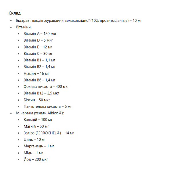 - Нормализует функцию мочевыделительной системы благодаря экстракту клюквы.