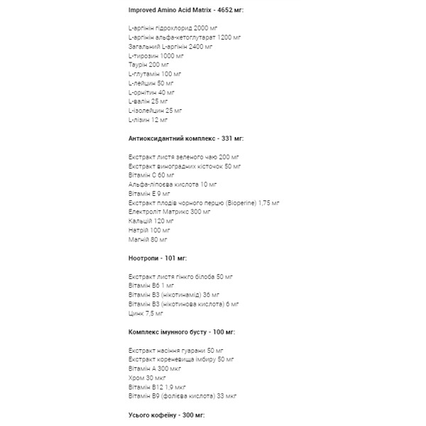 - Аминокислотная матрица: L-аргинин гидрохлорид, L-тирозин, таурин, L-глутамин, L-лейцин, L-орнитин, L-валин, L-изолейцин, L-лизин