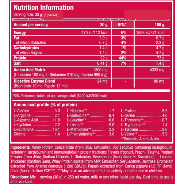 Scitec Nutrition 100% Whey Protein Professional – это высококачественный сывороточный протеин в удобной порционной сумке, предназначенный для поддержки роста мышц и восстановления после физических нагрузок. Продукт содержит оптимальное количество белка и обогащен аминокислотами, в том числе BCAA и глютамином. Благодаря современной технологии ультрафильтрации производителю удалось сохранить полезные белковые микрофракции, такие как лактоглобулины и иммуноглобулины, которые способствуют укреплению иммунитета. Входящий в состав комплекс ферментов улучшает переваривание белков и снижает риск расстройств пищеварения. Благодаря отличной растворимости и приятному вкусу, продукт идеально подходит как для профессиональных спортсменов, так и для любителей фитнеса.