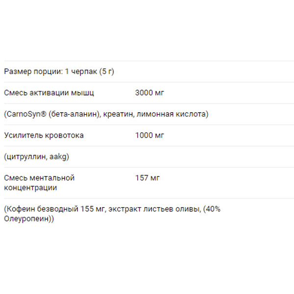 Принимайте 1-3 порции (1-3 мерных ковшика) за 30-45 минут до тренировки. Каждую порцию растворяйте в 150-250 мл воды. Перед открытием банки встряхните ее.