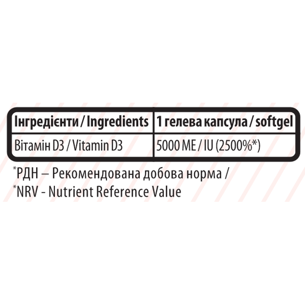 Vitamin D 3 5000 ME - диетическая добавка к рациону питания источник витамина D3. Способствует общему укреплению организма, нормализации функционирования мышц, усвоению кальция и фосфора, поддержанию оптимального уровня кальция в крови и нормального состояния костей и зубов.
